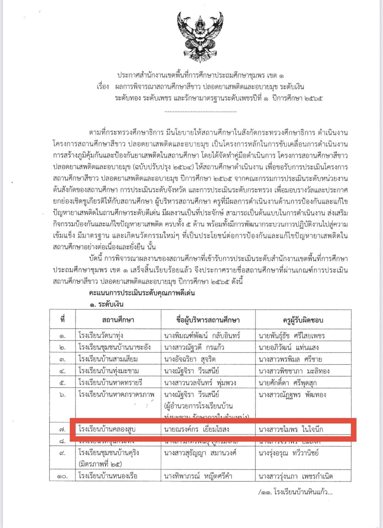 โครงการสถานศึกษาสีขาว ปลอดยาเสพติดและอบายมุข ปีการศึกษา 2565 คะแนนการประเมินคุณภาพ ระดับเงิน